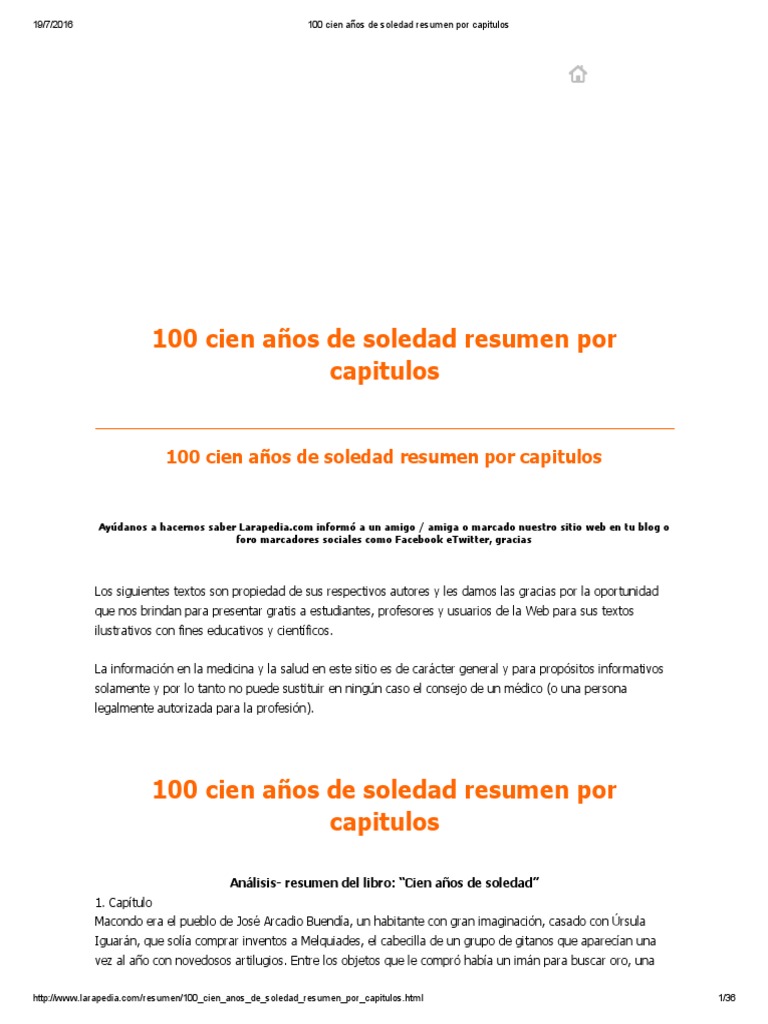60% (10) 60% encontró este documento útil (10 votos) 21k vistas 36 páginas. Al principio ni siquiera desempacó, se limitó a ayudar a amaranta úrsula a arreglar los desperfectos de la casa y a limpiar un poco. 100 cien años de soledad resumen por capitulos analisis de la obra cien años de soledad de gabriel garcia marquez temas claves de la obra la soledad es el eje central de la novela, la soledad como una ley que todos se ven obligados a padecer, ella entreteje todos los destinos de los personajes y es la característica esecencial de la familia.