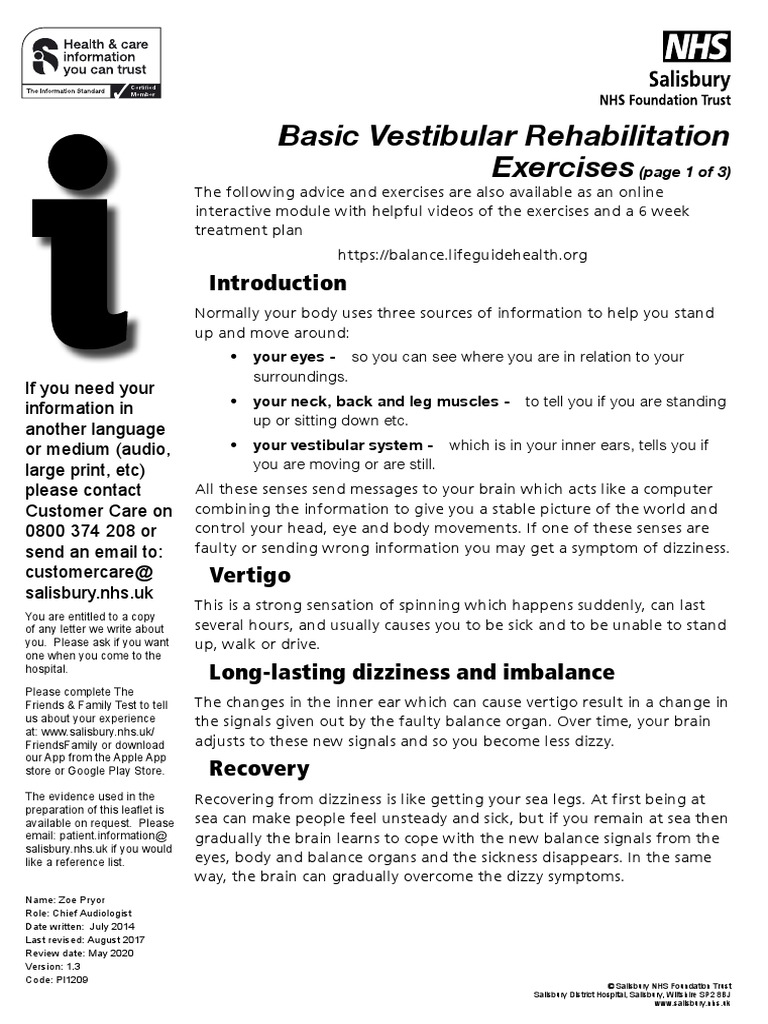 Vestibular rehabilitation exercises musculoskeletal physiotherapy community & therapy services this leaflet has been designed to explain the benefits of the treatment activity you have been taught, act as a reminder of Www.uhs.nhs.uk vestibular rehabilitation we have written this factsheet to give you more information about vestibular rehabilitation. When there is an injury or abnormality in any portion of this system, the brain must be retrained or taught to interpret correctly the information it receives.
